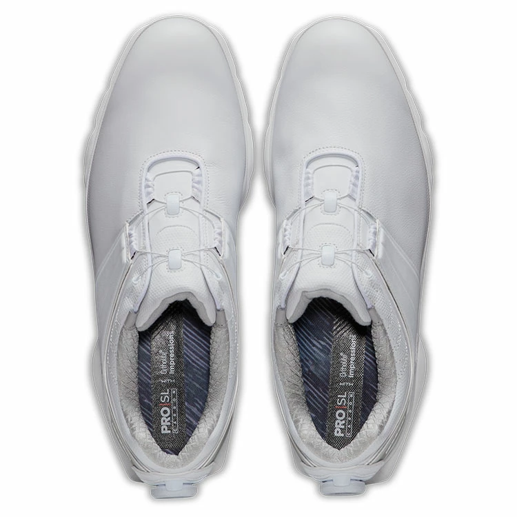 | FootJoy Pro SL Carbon BOA 53085 Golf Shoes Precision Fitting With BOA Lace System The brand new FootJoy Pro SL Carbon BOA is the ultimate players spikeless shoe that combines a soft and comfortable waterproof upper with a midsole/outsole unit that also features Carbon Fibre for tour level stability. This all comes courtesy of a proprietary polymer outsole material called Fine-Tuned Foam (FTF), which is 10% lighter than conventional EVA foams and provides enhanced cushioning and shock absorption for added comfort. Comprised of three layers of different densities fused together, FTF is the key material to ensure that Pro SL delivers comfort and stability. The top layer that cradles the foot is a softer durometer to provide all day comfort, while the lower portion is firmer to deliver perimeter stability around the foot for maximum support throughout the swing. The new BOA Custom Fitting Lacing System provides exceptional fit and is easily altered during the round and throughout the life of the shoes. Couple that with an Integrated Carbon Fibre Platform and the result is comfort with advanced stability and energy return. A new Infinity Outsole with over 100 individual rubber lugs provide complete traction and ground connectivity and the 3D molded foam collar features Ortholite impressions Fit-Bed for ground breaking comfort. The upper is made of ‘ChromoSkin’ leather by Pittards of England; a unique full grain leather which is supple, lightweight, thin yet durable and completely waterproof. For the ultimate in tour level performance, support and stability, choose Pro SL Carbon BOA and wear the shoe of the games best players. |
